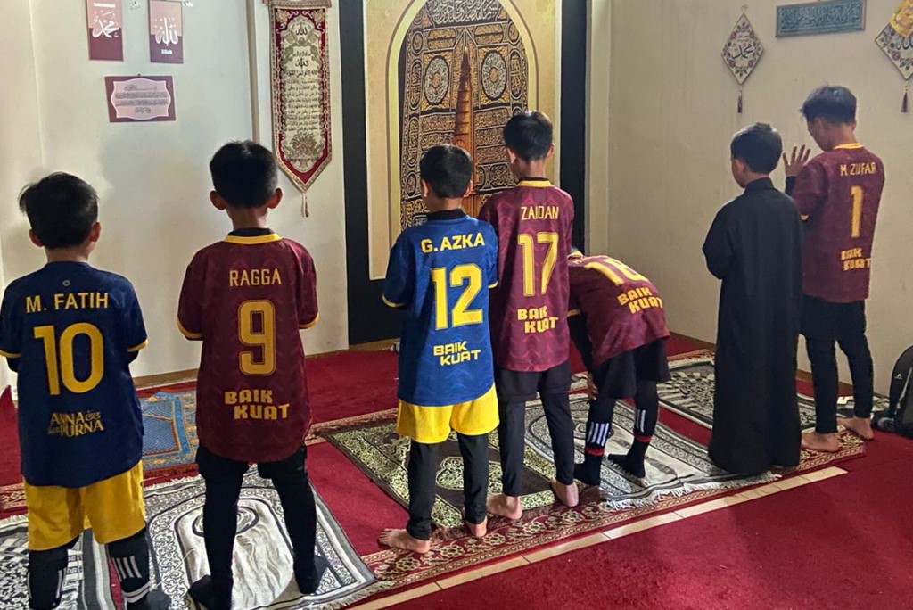Potret tim futsal SD Daarut Tauhiid menunaikan sholat duha sesaat sebelum pertandingan futsal berlangsung pada (18/8/2024) di Bikasoga Sport Center, Bandung.